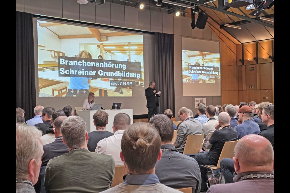 Wie sollen die neuen Ausbildungen für Schreinerinnen und Schreiner EFZ sowie Schreinerpraktikerinnen und -praktiker EBA künftig aussehen? Insbesondere die neue Praktische Arbeit als Teil des Qualifikationsverfahrens gab zu reden. Es wurde rege diskutiert. Dies war nicht nur gut, sondern ausdrücklich erwünscht. Am Samstag, 31. Januar 2026, kamen rund 250 Personen in den Technopark nach Zürich zur Branchenanhörung im Rahmen der Revision Grundbildung. Es waren Vertreterinnen und Vertreter verschiedenen Alters und aller Funktionen aus dem Gebiet des Verbands Schweizerischer Schreinermeister und Möbelfabrikanten (VSSM) anwesend. Sie wurden von den Sektionen rekrutiert.